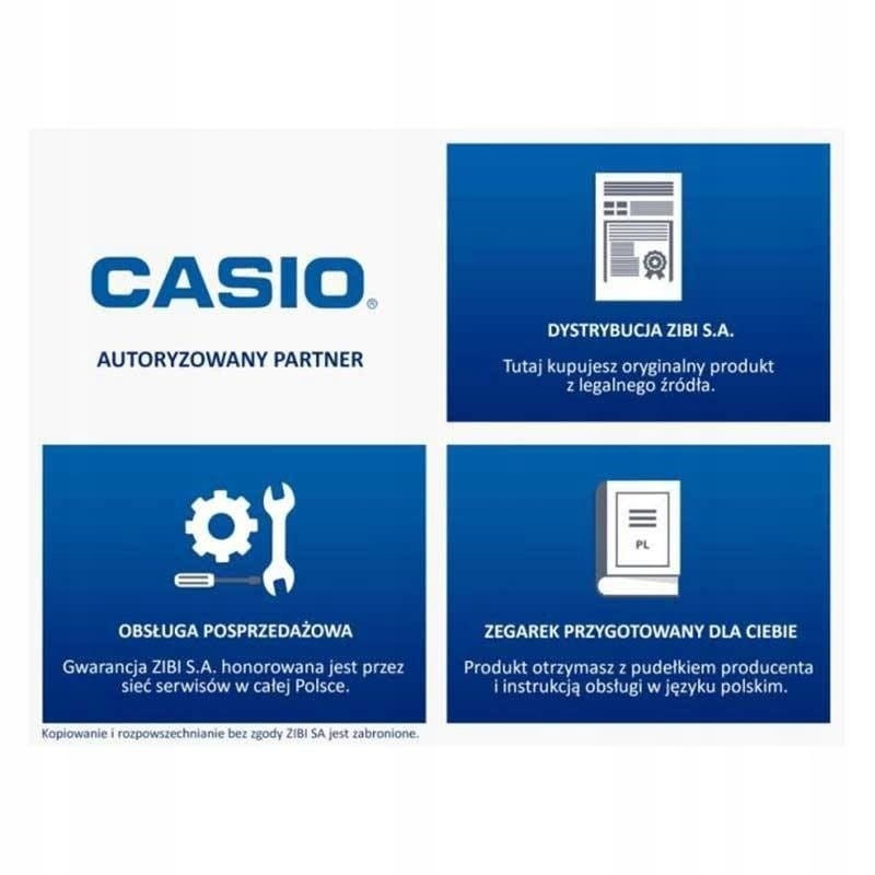 - Polską kartę gwarancyjną ZIBI -jedynego oficjalnego dystrybutora marki Casio w Polsce ważną 36 miesięcy na terenie całego kraju