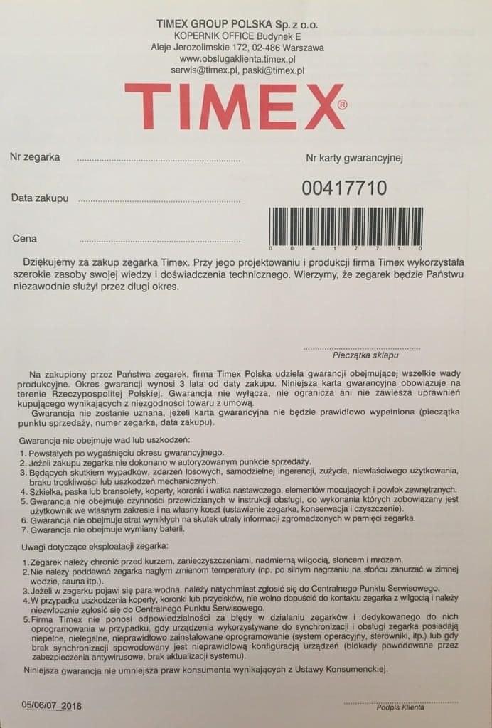 - Polską kartę gwarancyjną Timex ważną 24 miesiące na terenie całego kraju